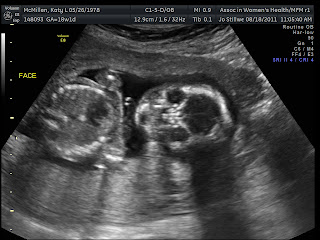 The sonogram showdown: Ryan missed it. Typical Ryan, he didn't leave work in time and missed the whole thing. So, I"m laying there, feeling like I'm having a girl and am watching Gravy like a hawk trying to get a glimpse of the nether region. I saw what I thought were the 3 lines indicating girl a few times but the sonographer said nothing. Finally, I said, "I already saw what the baby is, so if you're waiting to tell me until my husband gets here, there's no need." She looked surprised and said she hadn't even looked yet and always waits until the very last to make sure she has gotten all the views of the other organs she needs for the report. She then starts investigating gender and points out the scrotum and penis to me. What?!